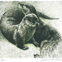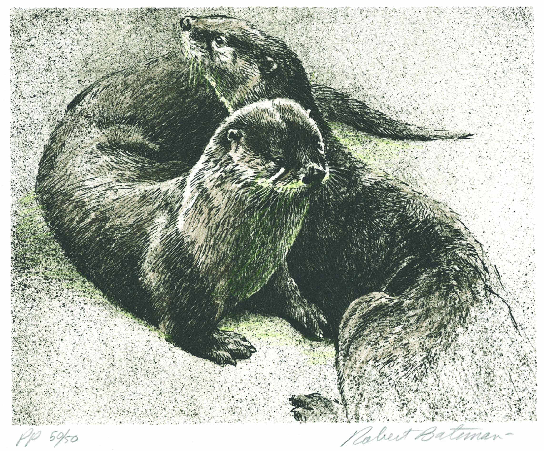 - a realistic depiction of two river otters in black and white.