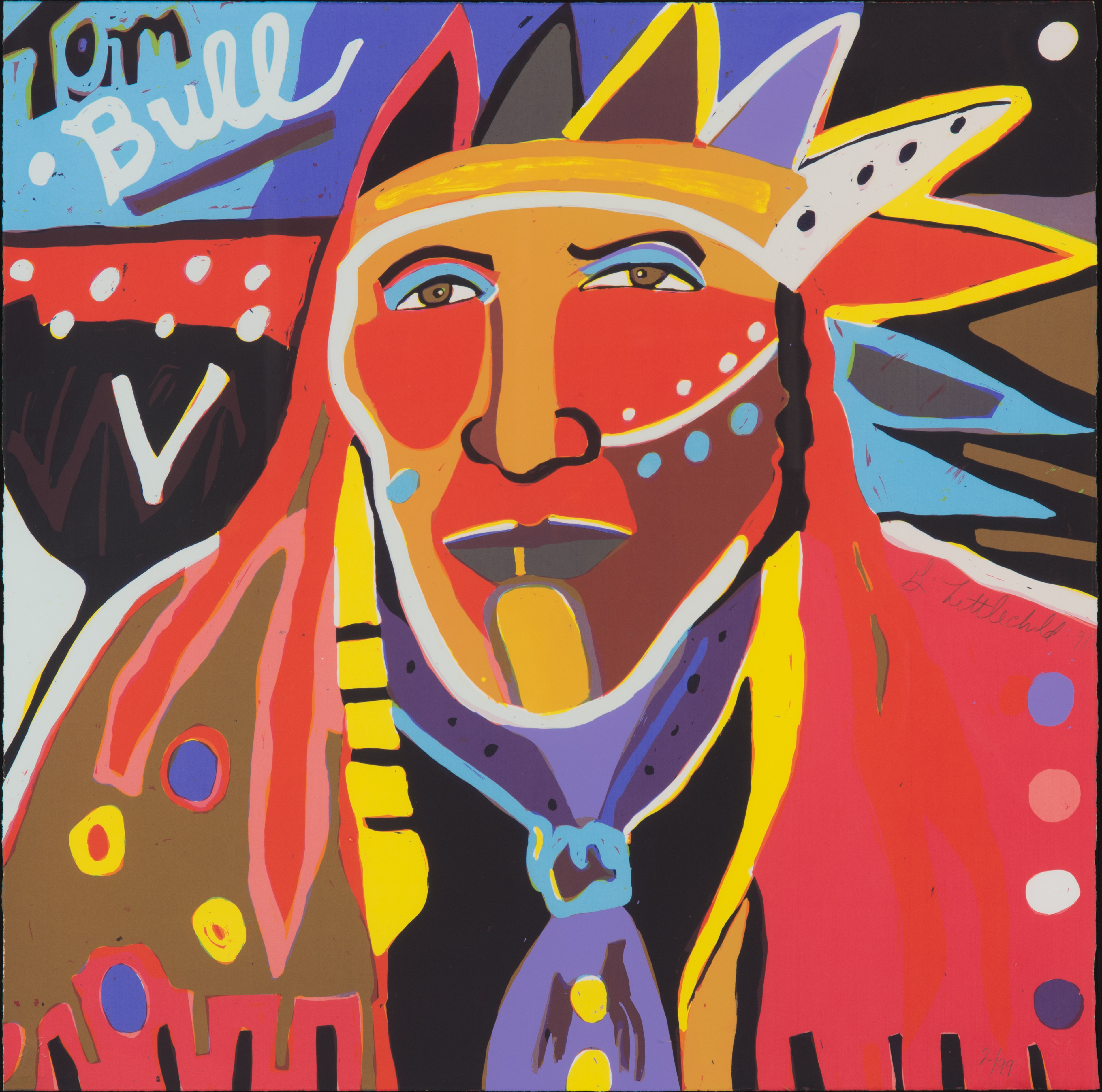 - portrait of an indigenous chief rendered in a bright colourful palette composed.