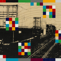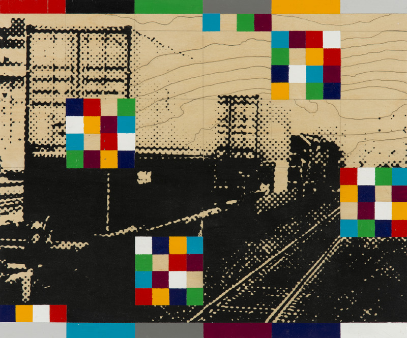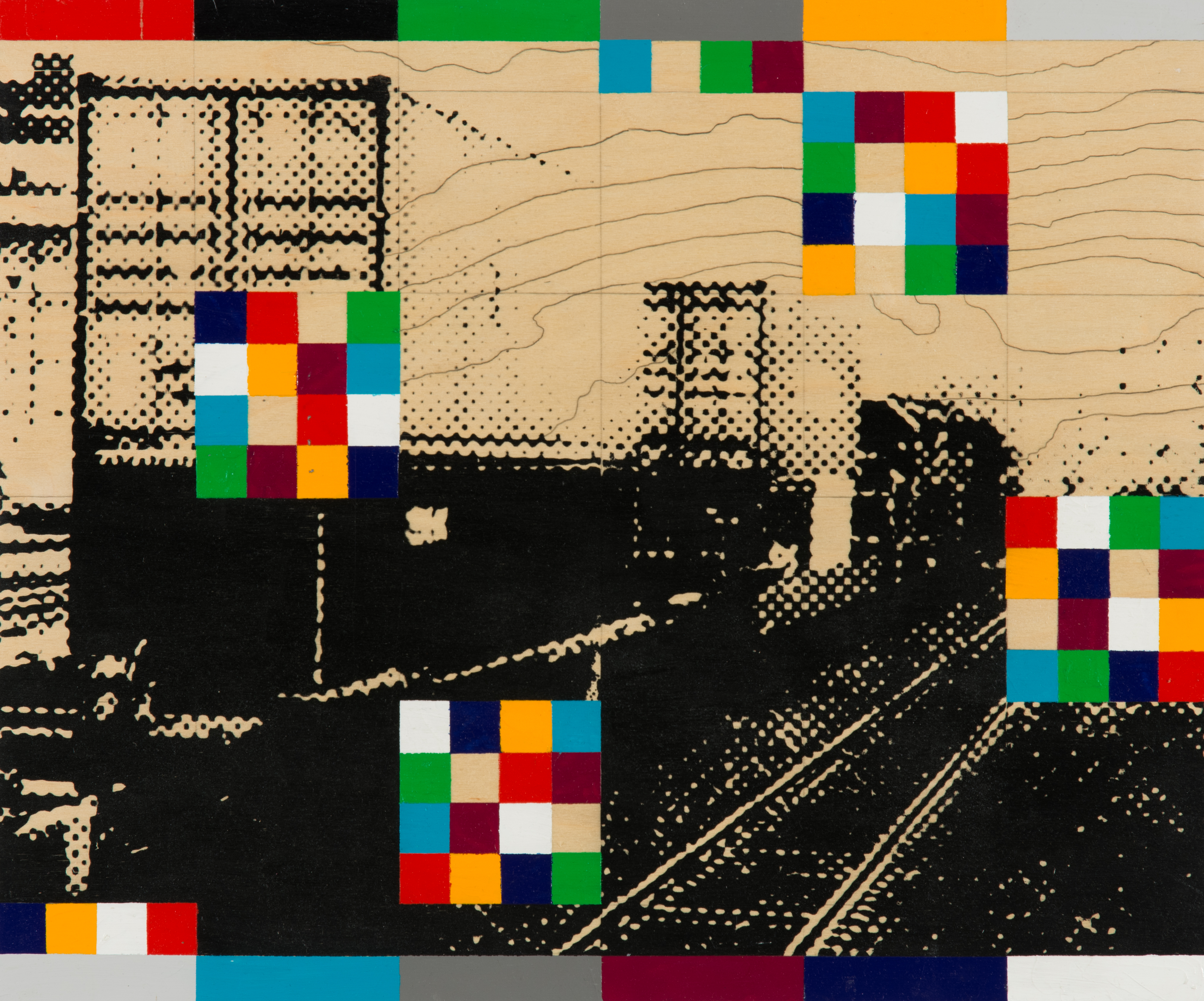 image of a train tracks in black against the wooden panel with four abstract multicoloured squares (red, black, green, blue, grey, yellow).