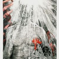 a black and white illustration of a man - his face covered by a ray of light - and next to him, a chicken with a red beak.
