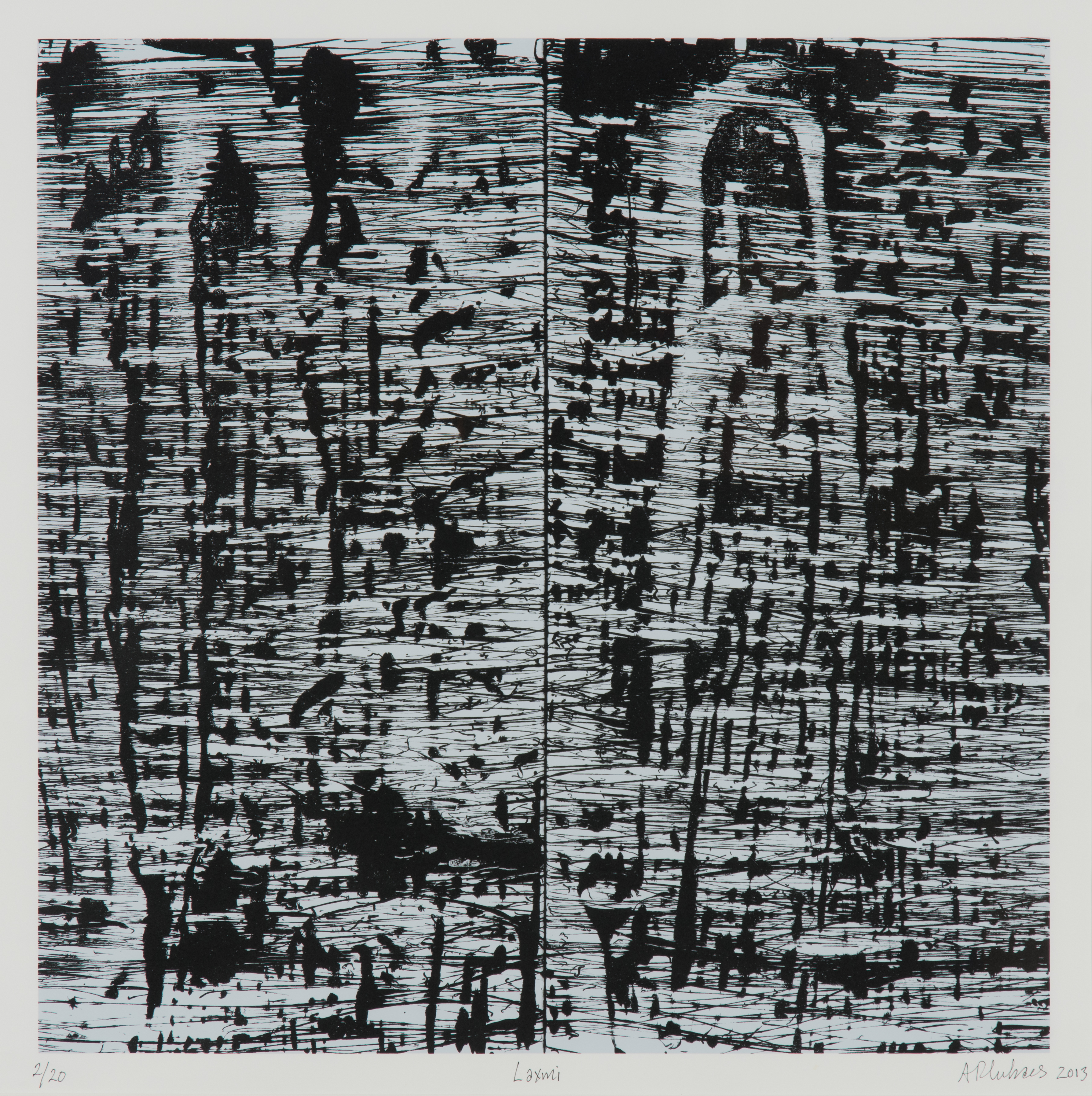 black and white abstract composition where the white area have fine lines going across, revealing the black.