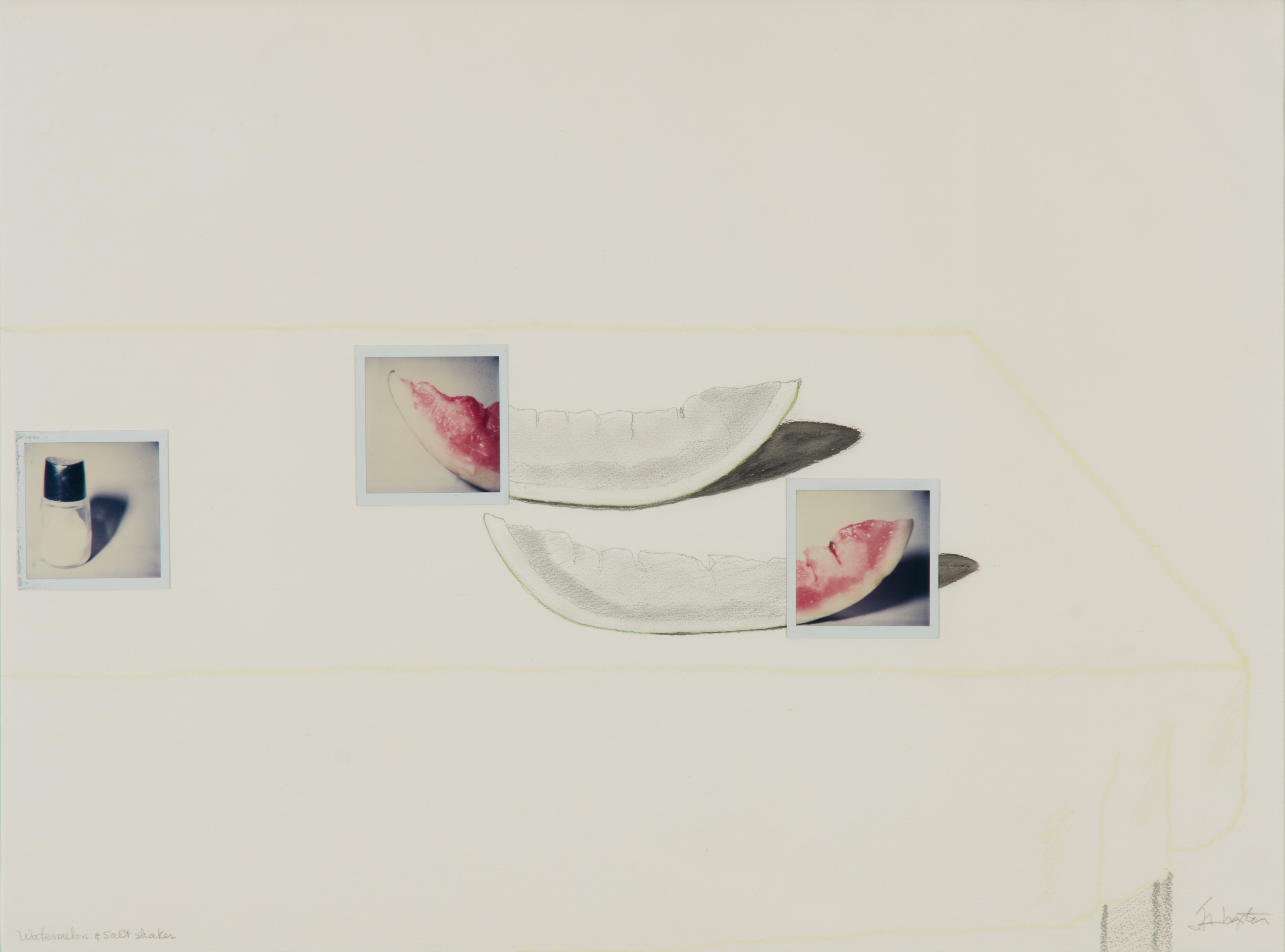 two slices of watermelon rendered in black and white with polaroid-like squares at each end, rendered in colour as well as a polaroid-like square of a salt shaker, rendered in colour.