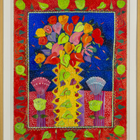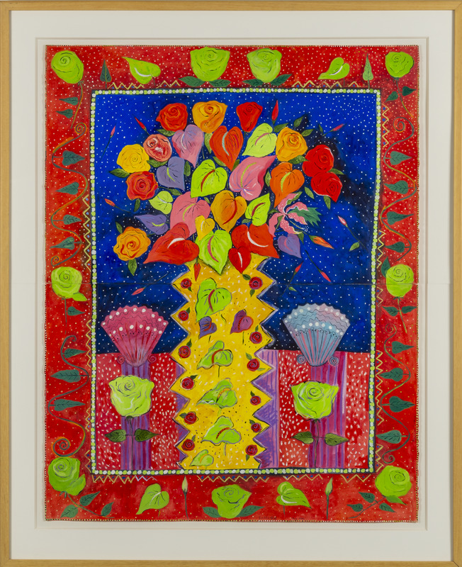 brightly painting of an abstract yellow vase of flowers with a abstract vases on each side alongside with green roses against blue background and the image is surrounded by a frame of vines and green roses against a red background.