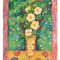 yellow flowers in an orange vase against a green background with pink rectangular sides.