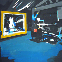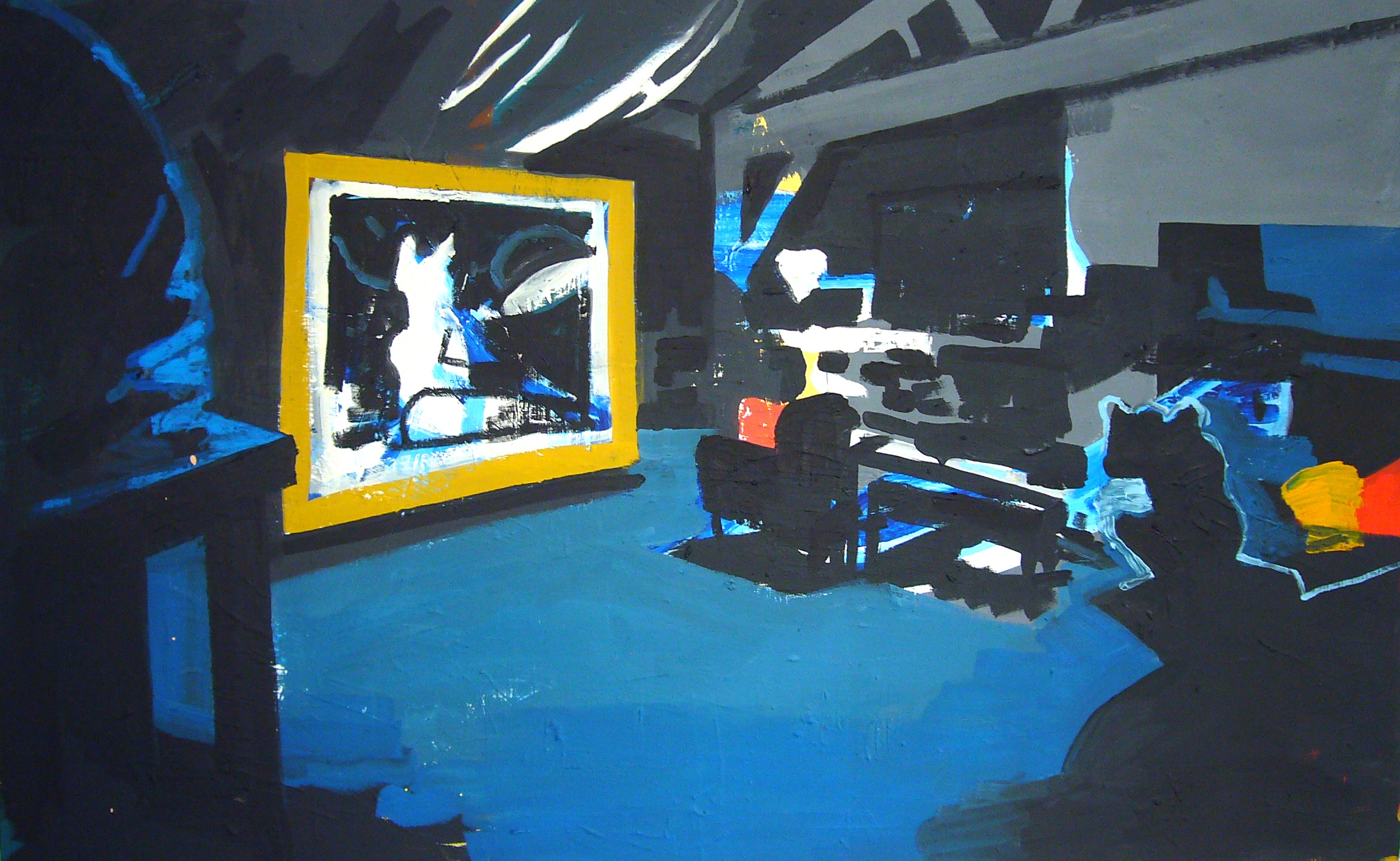 a painting depicting room with a large painting with a white figure on it and a desk besides it on blue floors and black walls.