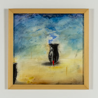 black abstract shape with a small red stripe against a blue and yellow background.