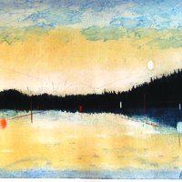 depiction of a landscape at sunset/sunrise with abstract oval shape dispersed throughout the center of the work.