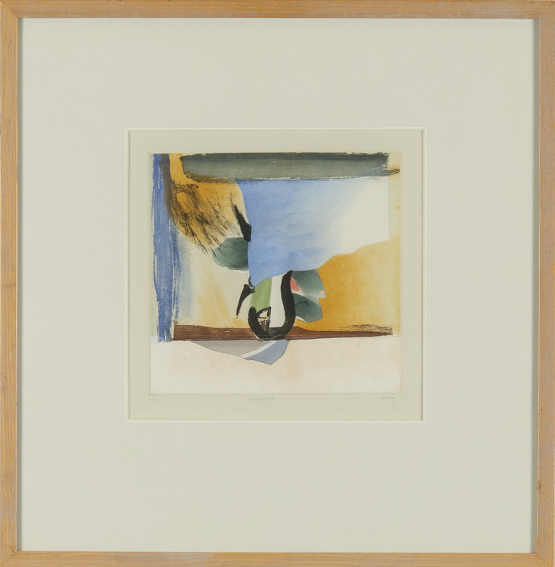 - abstract composition of blue, grey, green, and beige shapes.
