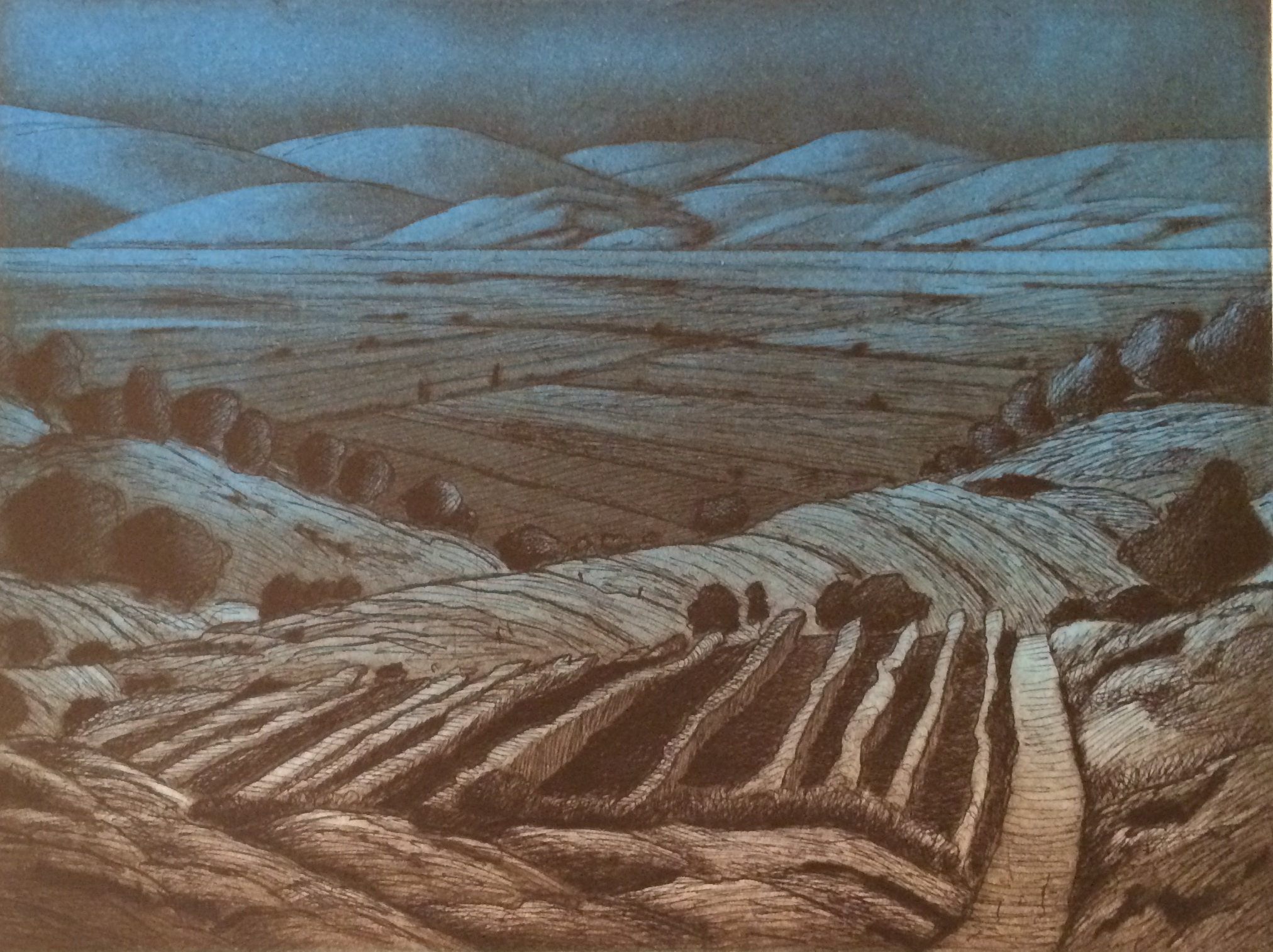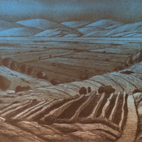 a landscape featuring moutains in the background, rendered in different colour washes.