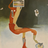 abstract human-like figure with a rectangle head that resembles a bar code against a black drop with collage-like elements.