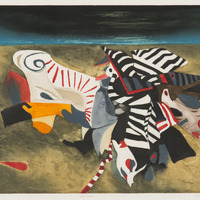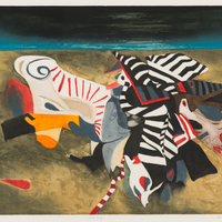abstract shapes in varying colours (white, black, red) against a beige-brown background with blue and black along the top.