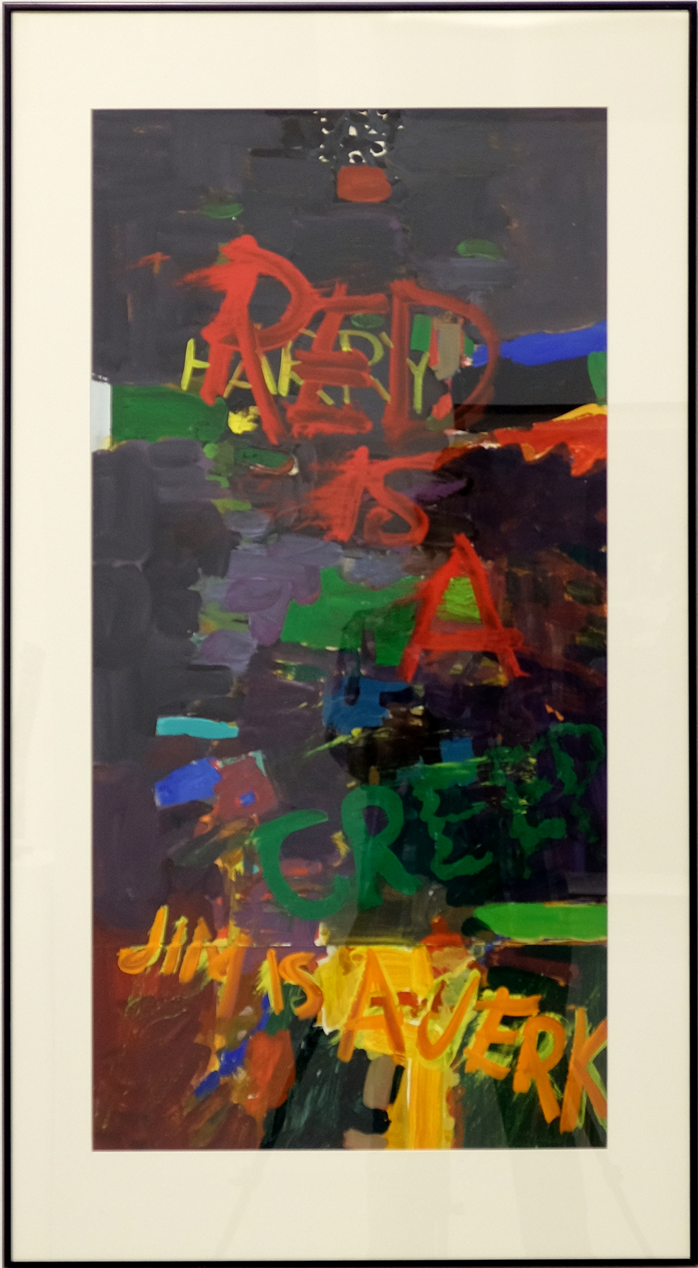 text that reads "red is a creep" and "Jim is a jerk" against a dark background.
