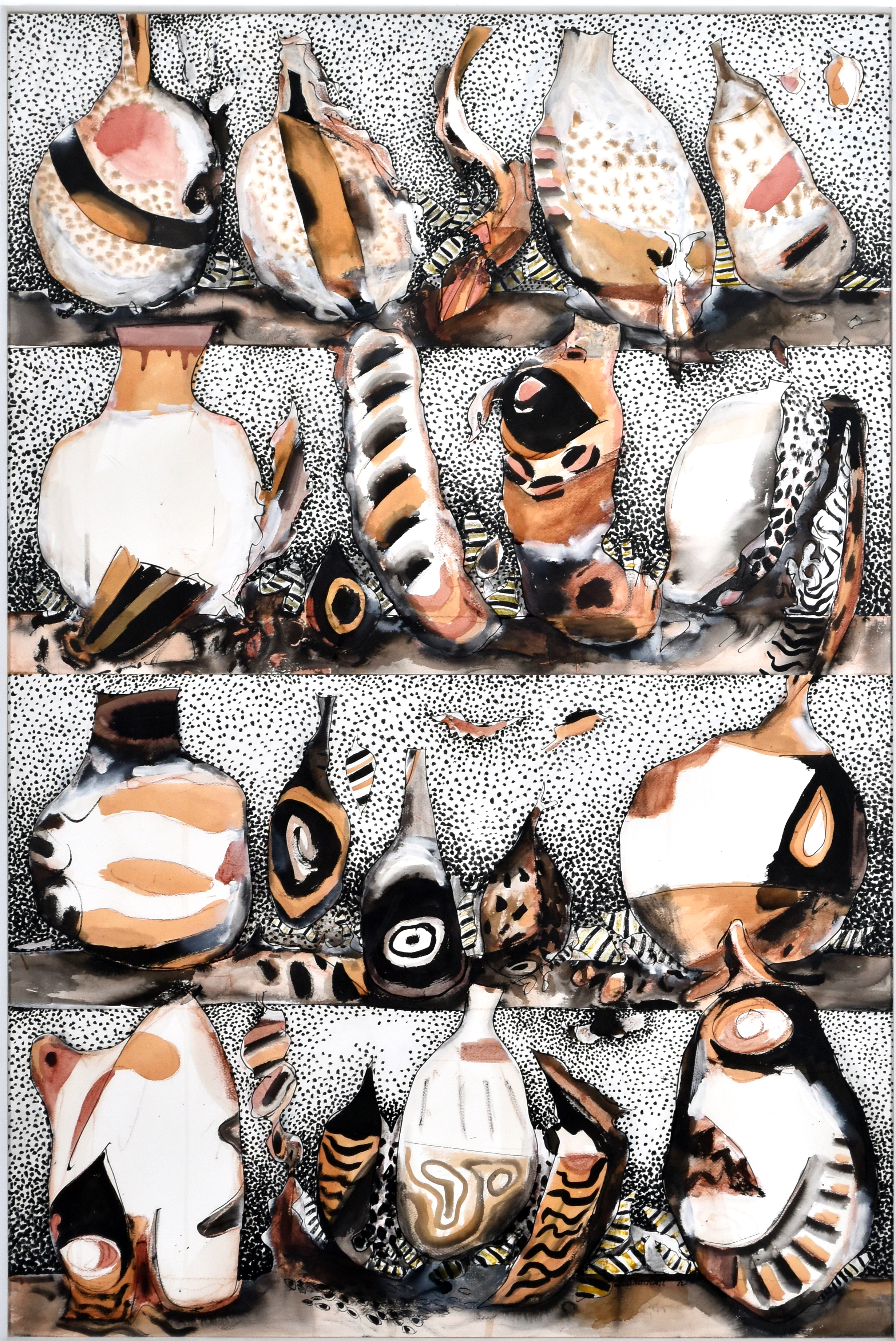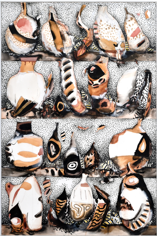 a series of abstract objects divided into four sections against a dotted background.