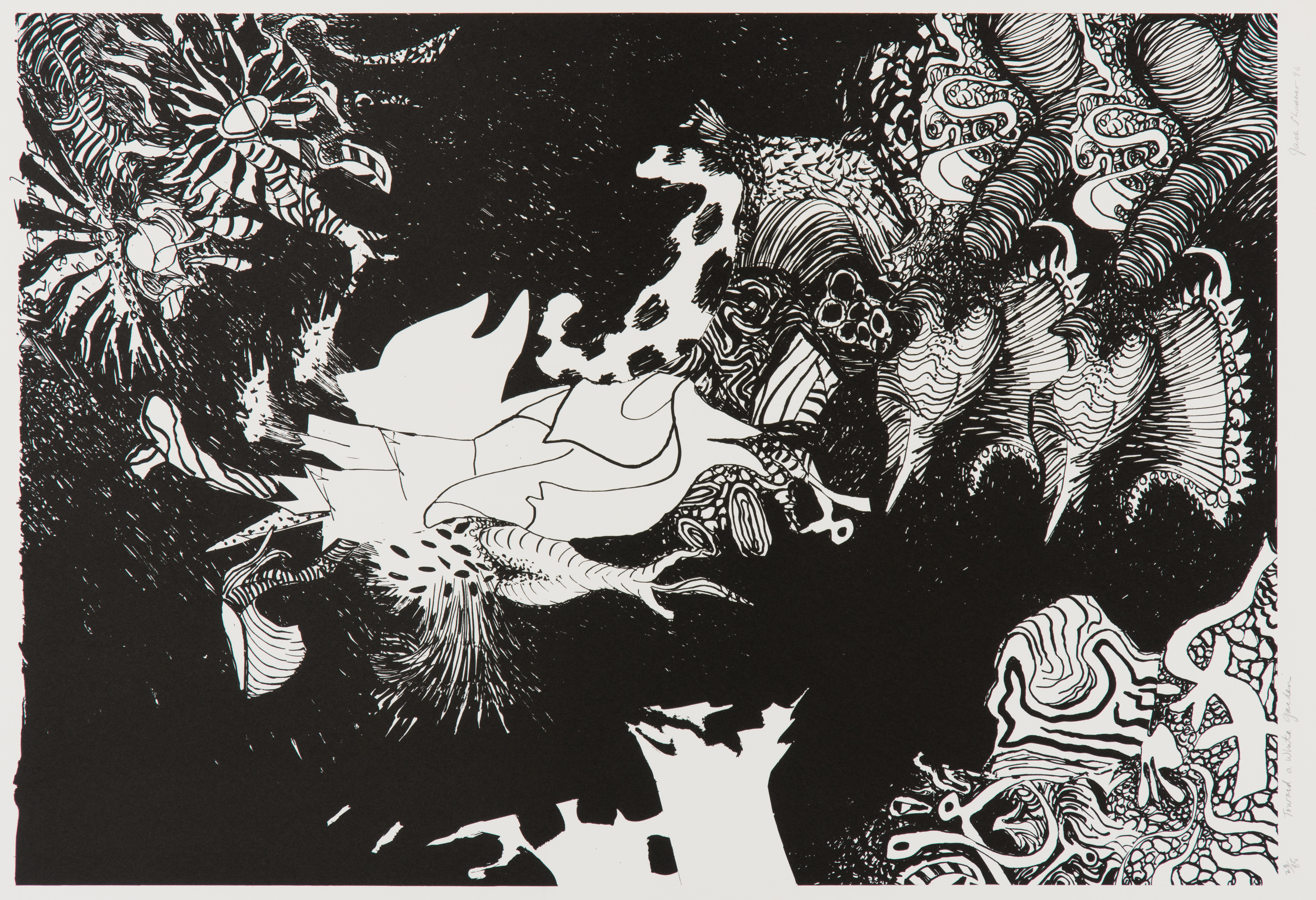 white abstract figure at centre surrounded similar abstract objects against a black background.